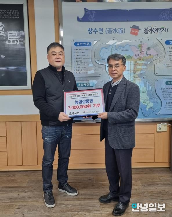안문종 창수면장은 “지역사회를 위한 기업의 따뜻한 나눔에 깊이 감사드린다”며 “기탁된 상품권은 도움이 필요한 가구에 투명하고 신속하게 전달해 주민들에게 실질적인 도움이 될 수 있도록 최선을 다하겠다”고 전했다.