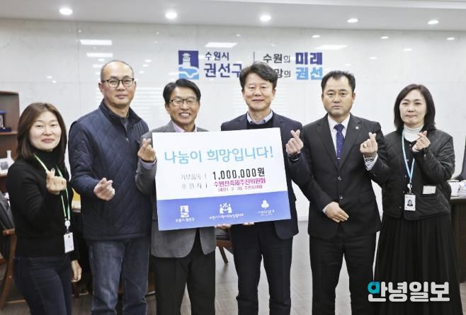 안녕일보 배윤 기자 | 수원시 권선구 수원천 축제 추진위원회(세류1·2·3동 주민자치회장)는 지난 19일, 권선구청을 방문하여 2025년 취약계층을 돕기 위한 기부금 100만원을 전달했다.