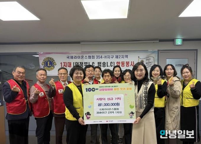 안녕일보 배윤 기자 | 의정부시 신곡2동주민센터는 11월 18일 국제라이온스협회 354-H 2지역 1지대가 성금 100만 원을 기탁하며 ‘100일간 사랑릴레이 배턴 잇기’에 동참했다고 밝혔다.