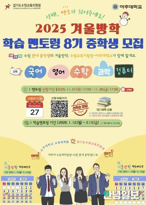 안녕일보 배윤 기자 | 경기도수원교육지원청은 2026년 1월 12일부터 2월 13일까지 관내 중학생을 대상으로 '2025 겨울방학 학습 멘토링 8기'를 운영한다. 이번 프로그램은 ZOOM을 활용한 비대면 소그룹(1:4) 멘토링으로 진행되며, 아주대학교 교육대학원과 협력해 운영하는 교육 기부 기반 상생 프로그램이다.