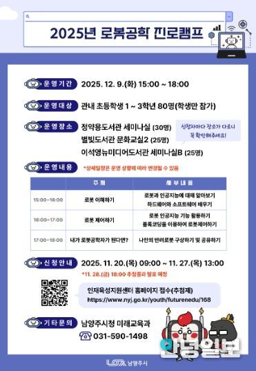 안녕일보 배윤 기자 | 남양주시는 20일부터 27일까지 관내 초등학교 1학년부터 3학년을 대상으로 ‘2025년 로봇공학 진로캠프’참가자를 모집한다.