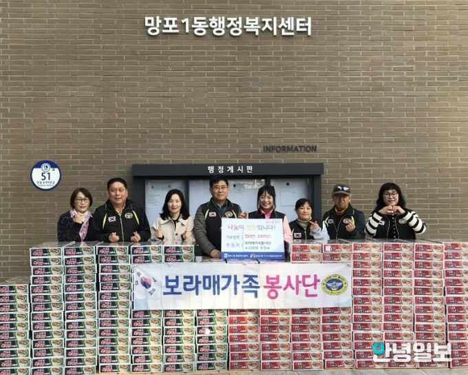 공군전우회 봉사 모임인 보라매가족봉사단은 망포1동의 어려운 이웃을 위해 꾸준히 후원을 해오고 있으며, 특히 이번 후원은 매월 나눔활동을 하고 있는 보라매가족봉사단의 100회째 나눔활동이며, 봉사단체가 결성된지 100개월이 되어 더욱 뜻깊은 후원이 됐다.