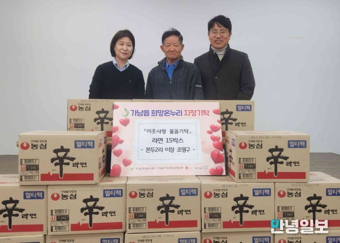 안녕일보 배윤 기자 | 가남읍행정복지센터는 지난 20일, 본두2리 조평구 이장이 관내 어려운 이웃들을 위해 라면 15박스를 기탁했다고 밝혔다.