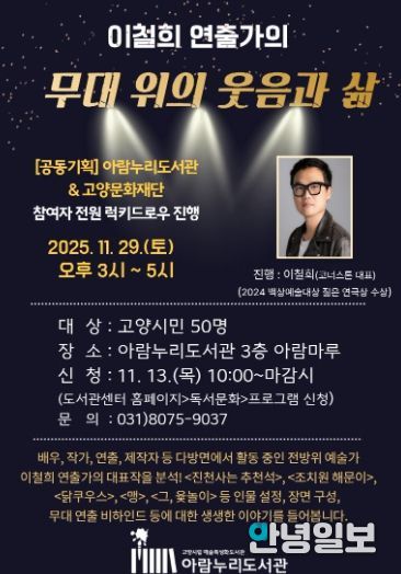 안녕일보 배윤 기자 | 고양특례시 아람누리도서관은 오는 29일 오후 3시, 2024년 제60회 백상예술대상 젊은 연극상 수상자인 이철희 연출가를 초청해 예술특성화 프로그램 ‘무대 위의 웃음과 삶’을 운영한다.