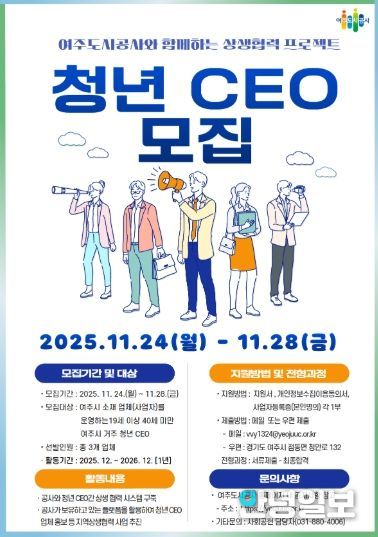 안녕일보 배윤 기자 | 여주도시공사는 지역 청년 사업가의 성장을 지원하고 공사와 민간의 상생협력 기발을 구축하기 위해 오는 24일부터 28일까지 ‘청년 CEO“를 모집한다고 밝혔다.