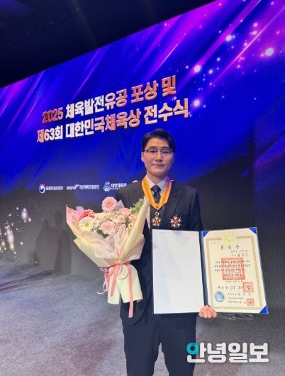 안녕일보 배윤 기자 | 고양특례시 소속 직장운동경기부 세팍타크로팀의 임안수 선수가 지난 21일 서울 웨스틴조선호텔 그랜드볼룸에서 열린 ‘2025 체육발전유공 포상 및 제63회 대한민국체육상 전수식’에서 체육훈장‘맹호장’을 수훈했다.