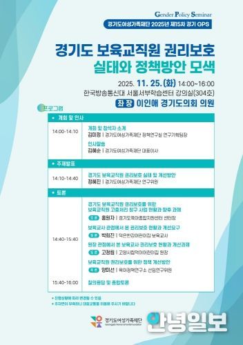 안녕일보 배윤 기자 | 경기도여성가족재단은 오는 25일 오후 2시 한국방송통신대학교 서울서부학습센터에서 ‘경기도 보육교직원 권리보호 실태와 정책방안 모색’을 주제로 정책토론회를 개최한다.