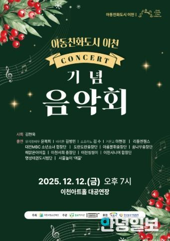 안녕일보 배윤 기자 | 이천시의 아동친화도시 지정을 기념하는 ‘아동친화도시 이천 기념 음악회’가 2025년 12월 12일 오후 7시, 이천아트홀 대공연장에서 성대하게 개최한다.