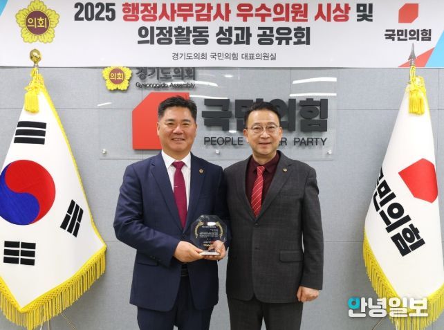 안녕일보 배윤 기자 | 경기도의회 경제노동위원회 정하용 의원(국민의힘, 용인5)은 24일, 국민의힘 회의실에서 열린 ‘2025년 행정사무감사 우수의원 시상식’에서 행정사무감사 우수위원으로 선정됐다. 이번 선정은 행정사무감사 기간 동안 도민생활과 직결된 핵심 현안들을 면밀히 점검하고, 구조적 문제를 드러내는 데 기여한 점이 높게 평가된 결과이다.