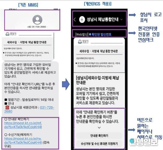 안녕일보 배윤 기자 | 성남시는 이달부터 차세대문자서비스(RCS: Rich Communication Service)를 도입해 체납통합안내 문자 서비스의 신뢰성과 보안성을 한층 강화했다고 밝혔다.