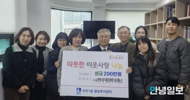 안녕일보 배윤 기자 | 수원시 팔달구 우만1동은 지난 24일, 사단법인 한국자원복지재단 사무실에서 관내 취약계층 지원과 복지사각지대 해소를 위해 활용될 성금 200만 원을 전달받았다.