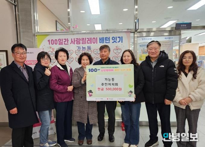 안녕일보 배윤 기자 | 의정부시 가능동주민센터는 11월 21일 가능동 주민자치회가 지역 내 어려운 이웃을 돕기 위해 성금 50만 원을 기탁하며 ‘100일간 사랑릴레이 배턴 잇기’에 동참했다고 밝혔다.