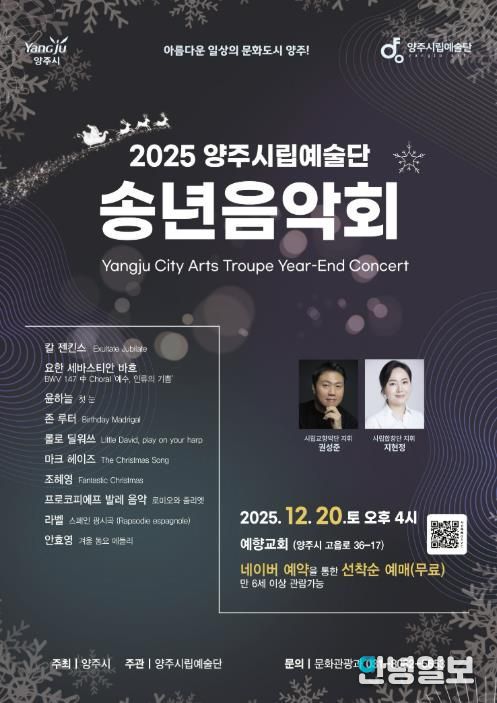 안녕일보 배윤 기자 | 양주시가 오는 12월 20일 오후 4시, 예향교회(고읍로 36-17)에서 ‘2025 양주시립예술단 송년음악회’를 개최한다.
