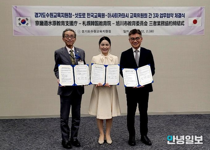 안녕일보 배윤 기자 | 경기도수원교육지원청은 12월 2일 일본 아사히카와시 교육위원회에서 삿포로한국교육원과 함께 3자 국제교류 업무협약(MOU)을 체결했다. 이번 협약은 한·일 간 교육협력 체제를 제도적으로 구축하고, 경기교육의 우수정책을 해외와 공유하기 위해 마련됐다.