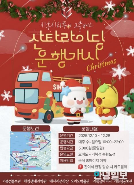 이벤트 운영 기간 버스 내부에는 루돌프ㆍ산타ㆍ트리 등 크리스마스를 상징하는 소품과 캐럴 음원, 포토존이 배치돼 따뜻한 연말 감성을 느낄 수 있도록 구성했다. 특히 야간 시간대에는 거북섬과 오이도 일대의 야간 경관과 어우러져, 겨울 바다와 조명이 조화를 이루는 특별한 승차 경험을 제공할 예정이다.