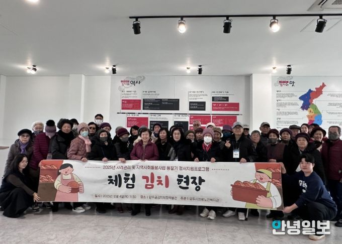 안녕일보 배윤 기자 | 양주시희망노인복지관이 지난 4일 동절기를 맞아 어르신들의 정서적 안정감 향상과 건전한 여가활동 지원을 위해 양주골김치체험박물관에서 동절기 정서적 지원 프로그램 ‘체험 김치 현장’을 운영했다.