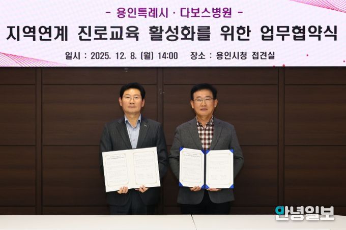 이날 이상일 시장과 양성범 다보스병원 이사장은 시청 시장접견실에서 ‘지역연계 진로교육 활성화를 위한 업무협약’을 맺었다.