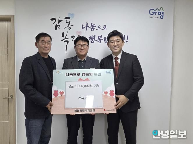 안녕일보 배윤 기자 | 가평군 북면 적목교회 이순직 목사는 최근 북면 행정복지센터를 방문해 관내 어려운 이웃들을 위해 성금 100만원을 기탁했다.
