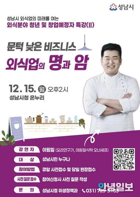 안녕일보 배윤 기자 | 성남시는 오는 12월 15일 오후 2시 시청 1층 온누리에서 이원일 셰프(요리사)를 초빙해 외식업 창업의 현실에 관한 특강을 연다.