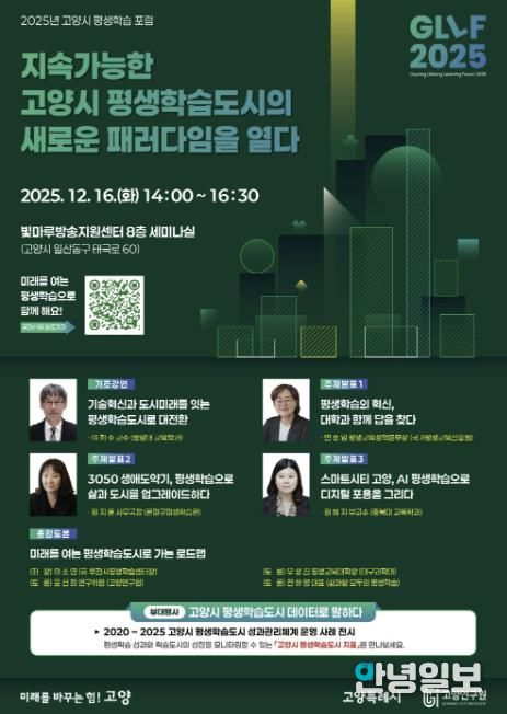 안녕일보 배윤 기자 | 고양특례시는 오는 16일 오후 2시, 빛마루방송지원센터 8층 세미나실에서 ‘2025 고양시 평생학습 포럼(GLLF 2025)’을 개최한다고 밝혔다.
