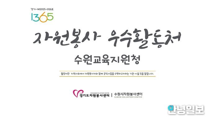 안녕일보 배윤 기자 | 경기도수원교육지원청은 체계적인 교육 자원봉사 운영 성과를 인정받아 ‘2025 경기도 우수 활동처’로 선정됐으며, 12월 16일 수원시자원봉사센터에서 열린 현판 전달식에 참석해 인증 현판을 수여받았다고 밝혔다.