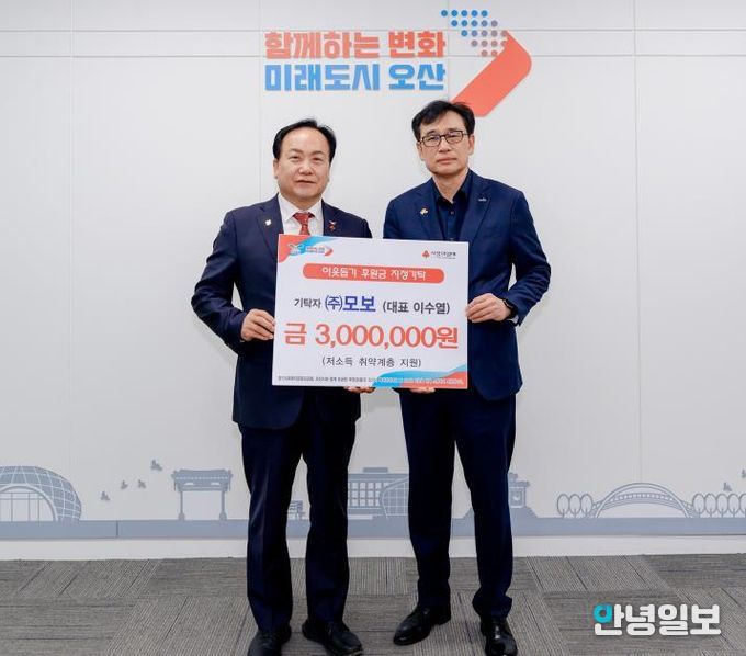 안녕일보 배윤 기자 | 오산시는 지난 16일 ㈜모보로부터 지역 내 저소득 취약계층 지원을 위한 후원금 300만 원을 기탁받았다고 밝혔다.