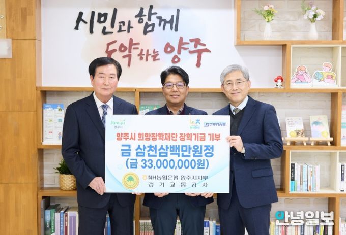안녕일보 배윤 기자 | NH농협은행 양주시지부·경기교통공사는 12월 17일 양주시청에서 (재)양주시희망장학재단에 인재 양성과 교육 발전을 위한 장학기금 3천3백만원을 기부했다.