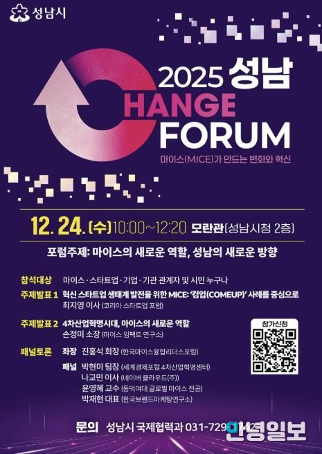 안녕일보 배윤 기자 | 성남시는 오는 12월 24일 오전 10시 성남시청 모란관에서 ‘2025 성남 체인지 포럼(CHANGE Forum)’을 개최한다.