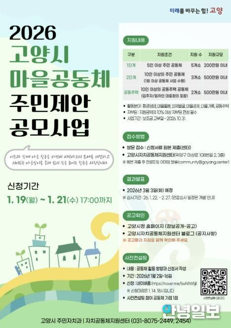 안녕일보 배윤 기자 | 고양특례시는 이웃과 함께 마을 활동에 참여하며 주민 스스로 지역 문제를 해결해 나가는 ‘2026년 고양시 마을공동체 주민제안 공모사업’에 참여할 공동체를 내년 1월 19일부터 모집한다고 밝혔다.