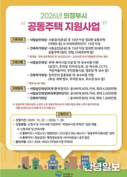 안녕일보 배윤 기자 | 의정부시는 노후 공동주택의 관리비용 부담 완화와 주거환경 개선을 위해 내년 1월 30일까지 ‘2026년 공동주택 지원사업’ 신청을 받는다.