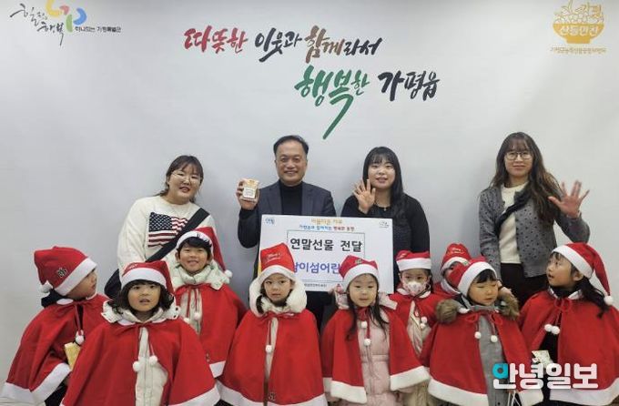 안녕일보 배윤 기자 | 가평군 가평읍 소재 남이섬어린이집 선생님과 아이들은 지난 19일 가평읍 행정복지센터를 방문해 따뜻한 연말 선물을 전달했다.