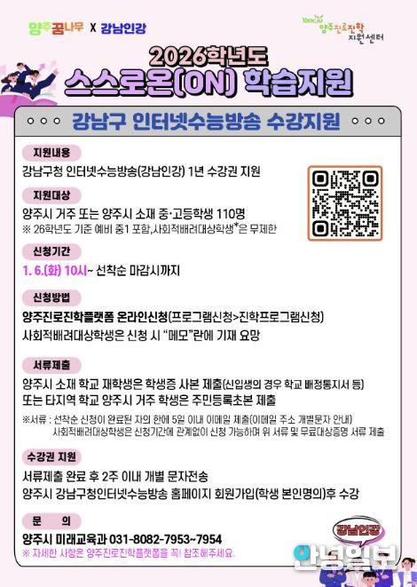 이번 강남인강 수강권 지원 사업은 1월 6일 오전 10시부터 양주진로진학플랫폼을 통해 선착순으로 신청을 받는다.