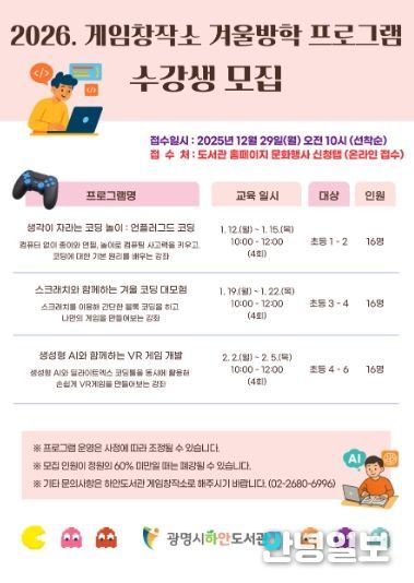 김광용 하안도서관장은 “이번 겨울방학 프로그램은 아이들이 창의 교육을 통해 디지털 세상의 원리를 이해하고, 스스로 문제를 해결하는 능력을 기를 수 있는 기회가 될 것”이라며 “미래 교육에 관심 있는 학생과 학부모의 많은 참여를 바란다”고 말했다.