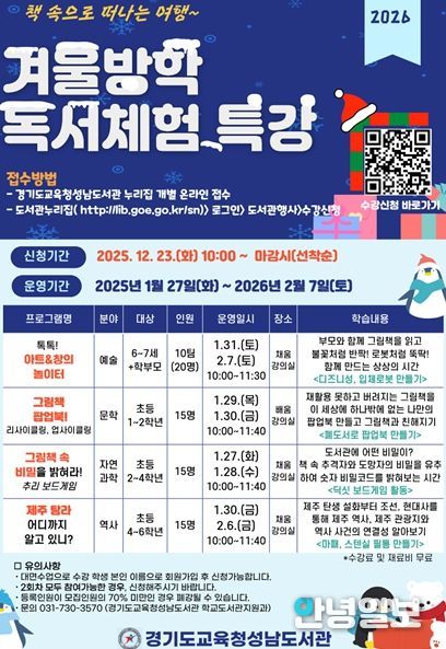 ‘겨울방학 독서교실과 겨울방학 독서체험 특강’의 참가자는 23일부터 경기도교육청성남도서관 누리집을 통해 선착순으로 모집한다.