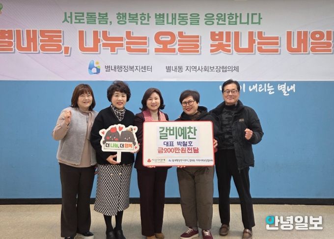 안녕일보 배윤 기자 | 남양주시는 지난 18일 별내행정복지센터에서 별내동 소재 음식점 갈비예찬이 연말을 맞아 관내 어려운 이웃을 돕기 위해 후원금 200만 원을 기탁했다고 22일 밝혔다.