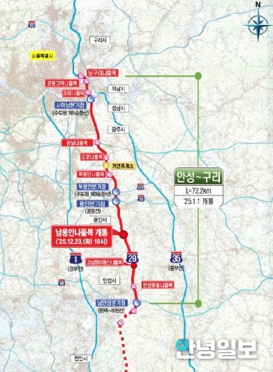 안성~용인~구리 구간(72.2㎞)은 1월 1일 개통됐다. 이 가운데 처인구 모현읍에서 원삼면까지 용인을 남북으로 관통하는 구간의 길이는 26㎞다. 포천~구리 구간(44.6㎞)은 지난 2017년 개통됐고, 안성~세종 구간(59.5㎞)은 2026년 말 개통 예정이다.