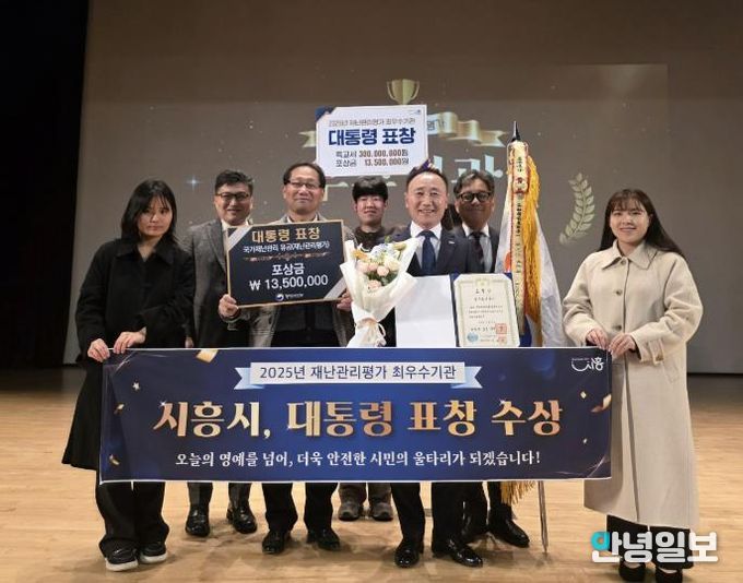 안녕일보 배윤 기자 | 시흥시는 행정안전부가 주관한 ‘2025년 재난관리평가’에서 최우수기관으로 선정돼 지난 12월 22일 정부세종청사 국토교통부 대강당에서 열린 시상식에서 대통령 표창을 받고 특별교부세 3억 원과 포상금 1,350만 원을 확보했다.