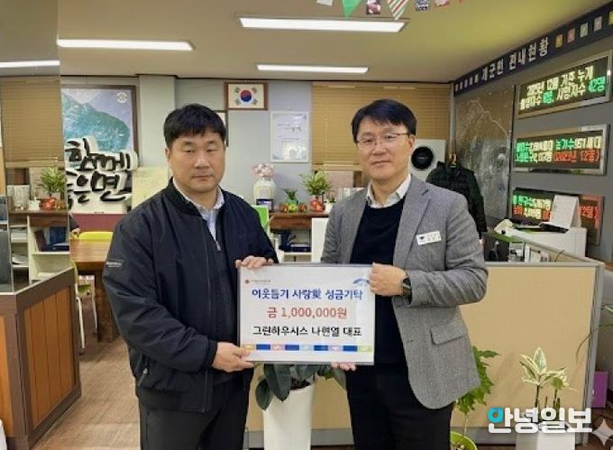 안녕일보 배윤 기자 | 양평군 개군면은 지난 24일, 그린하우시스 나현열 대표가 지역 내 어려운 이웃을 돕기 위해 개군면에 성금 100만 원을 기탁했다고 밝혔다.