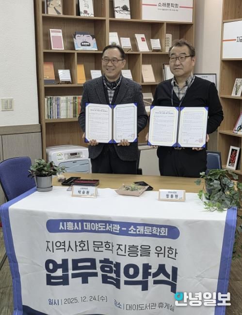 안녕일보 배윤 기자 | 시흥시 대야도서관은 지역 문학단체인 소래문학회와 지난 12월 24일, 대야도서관 휴게실에서 지역 문학 진흥 및 독서문화 확산을 위한 업무협약을 체결했다.