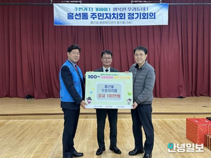 안녕일보 배윤 기자 | 의정부시 흥선동행정복지센터는 12월 23일 흥선동 주민자치위원회가 ‘100일간 사랑릴레이 배턴 잇기’에 동참해 성금 100만 원을 기탁했다고 밝혔다.