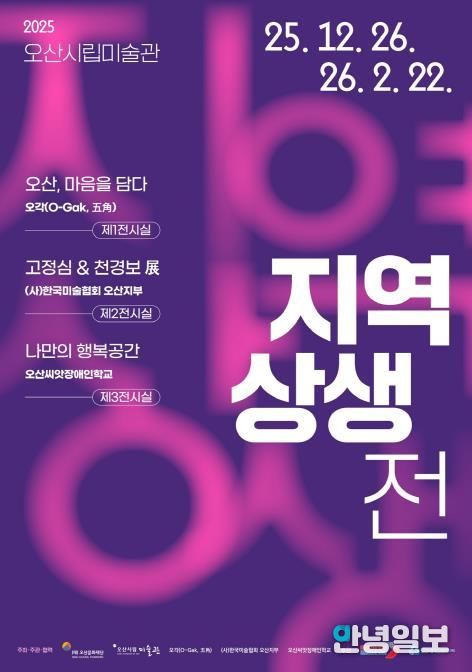'2025 지역 상생전'은 2025년 12월 26일부터 2026년 2월 22일까지 오산시립미술관에서 진행되며, 매주 월요일과 1월 1일, 설날 당일은 휴관한다. 전시에 대한 자세한 내용은 오산문화재단 누리집을 통해 확인할 수 있다.