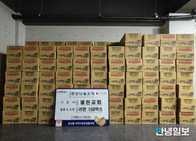 안녕일보 배윤 기자 | 고양특례시 덕양구 관산동은 지난 24일, 연말을 맞아 열린교회가 저소득층을 위해 컵라면 150박스를 기부했다고 밝혔다.