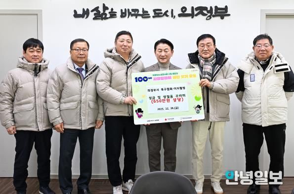 안녕일보 배윤 기자 | 의정부시는 12월 26일 의정부시축구협회가 帤일간 사랑릴레이 배턴 잇기’에 동참해 성금 300만 원과 350만 원 상당의 생필품 꾸러미를 기부했다고 밝혔다.
