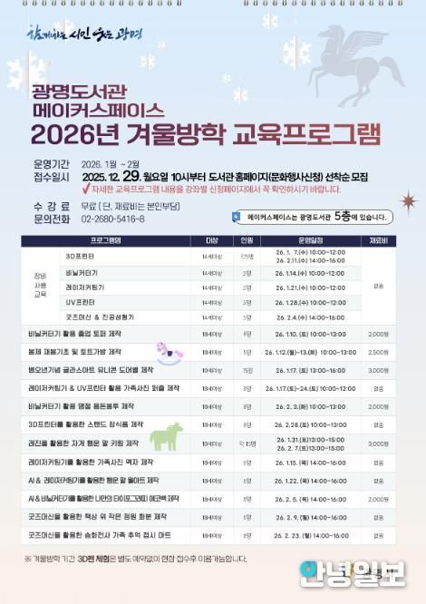 안녕일보 배윤 기자 | 광명시 광명도서관은 오는 29일부터 ‘메이커스페이스 2026년 겨울방학 교육 프로그램’ 참가자를 모집한다.