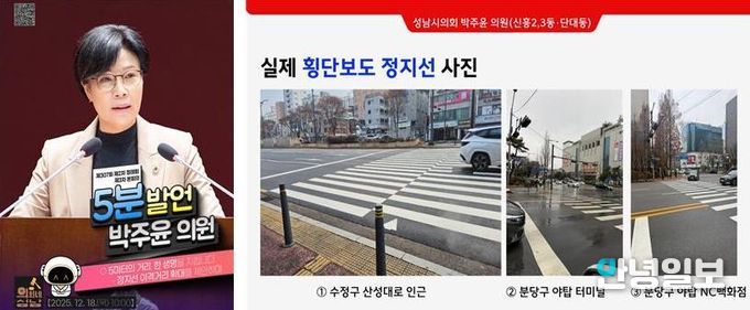 안녕일보 배윤 기자 | 성남시의회 박주윤 의원(국민의힘, 신흥2·3동·단대동)은 12월 18일 열린 제307회 성남시의회 제3차 본회의 5분 발언에서 보행자의 생명과 직결된 ‘횡단보도 정지선 이격거리 확대 설치’의 시급성을 강조하며, 성남시의 적극적인 개선책 마련을 촉구했다.