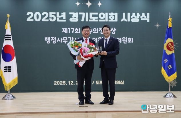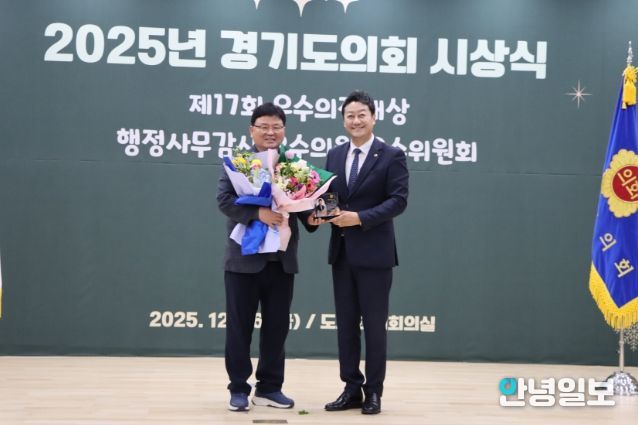 안녕일보 배윤 기자 | 경기도의회 교육기획위원회 이택수 의원(국민의힘, 고양8)과 성기황 의원(더불어민주당, 군포2)이 26일 열린 2025년 경기도의회 시상식에서 ‘2025년 행정사무감사 우수위원’으로 선정됐다.