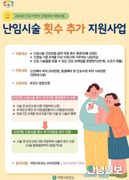 안녕일보 배윤 기자 | 이천시는 난임시술 건강보험 지원 횟수를 모두 소진한 난임 부부에게 심리적·경제적 부담을 완화하고 출산 친화적 환경을 조성하고자 2026년 ‘난임시술 횟수 추가 지원사업’을 새롭게 추진한다.