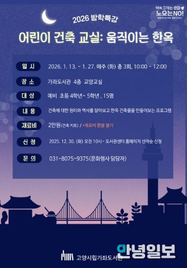 안녕일보 배윤 기자 | 고양특례시 가좌도서관은 2026년 1월 13일부터 27일까지 매주 화요일 3회차에 걸쳐 방학특강 프로그램 ‘어린이 건축 교실: 움직이는 한옥’을 운영한다고 밝혔다.