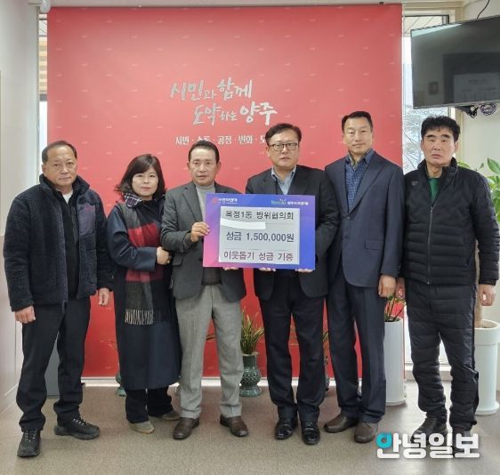 안녕일보 배윤 기자 | 양주시 옥정1동 방위협의회가 29일 옥정1동 행정복지센터를 방문해 어려운 이웃을 돕는 데 써달라며 성금 150만 원을 기탁했다.