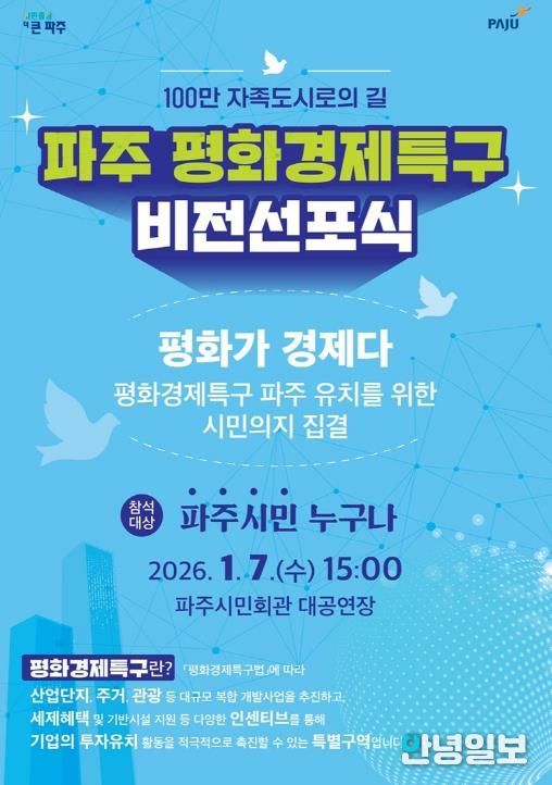 안녕일보 배윤 기자 | 파주시는 오는 1월 7일 15시, 파주시민회관 대공연장에서 ‘파주 평화경제특구 비전선포식’을 개최한다고 밝혔다.